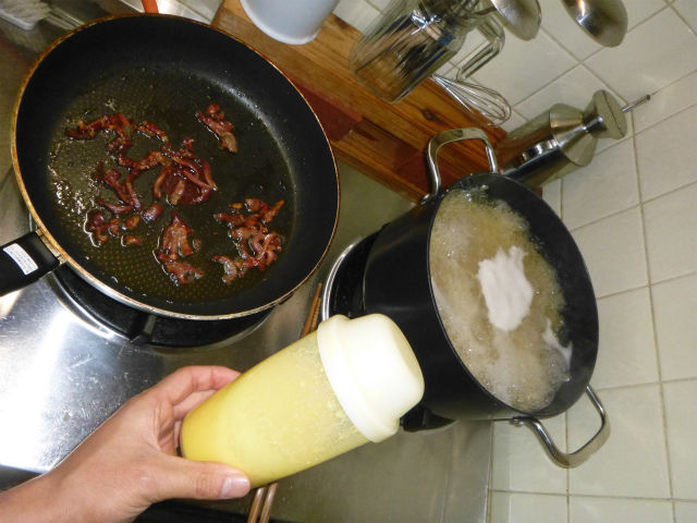 で、今日の昼食はカルボナーラ。ある時期、カルボナーラばっかり作っていた時期があったのに、そう言えば自分ん家の卵で作った事がなかったなぁと。ハモンセラーノをカリカリに焼いて、チーズ等々をシェイカーでシェイク。