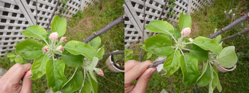 リンゴの摘蕾。リンゴは1カ所から5個くらいのツボミが発生するので、果実を大きくするには予め本命以外を間引く。写真は、4年目のシナスイート。受粉木はアルプス乙女。