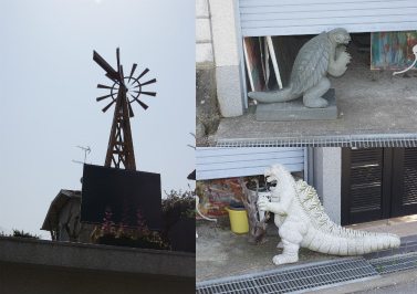 近所の公園へ花見散歩。道中、最近風車をおっ建てたご近所さんが、風吹いてないけど見せてあげようと、風車を回してくれた。謎のパネルはソーラーパネルで、風がない日は電力で回る仕組みらしい。ついでに、ゴジラとガメラも撮らせてもらった。