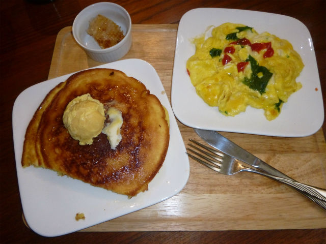 今朝産みタマゴで娘さんがホットケーキを焼いた。