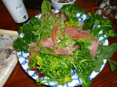 野菜タップリ肉チョット企画。サラダの上にハモンセラーノを乗せる。レタスの他に、白菜やチンゲンサイの花やつぼみが庭に沢山あるので、それらも食す。