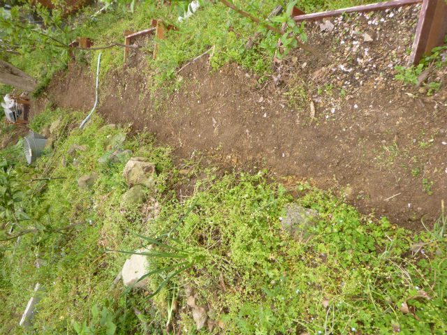 雨上がりの翌日、柔らかくなった庭を整地。普段余り通らない道を拡張した。