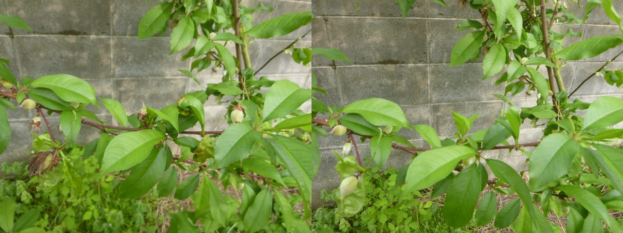 桃のプレ摘果。桃は袋がけの前に摘果して実を選定するが、その前にどうせ摘まれる運命にある実を先にとっておく。