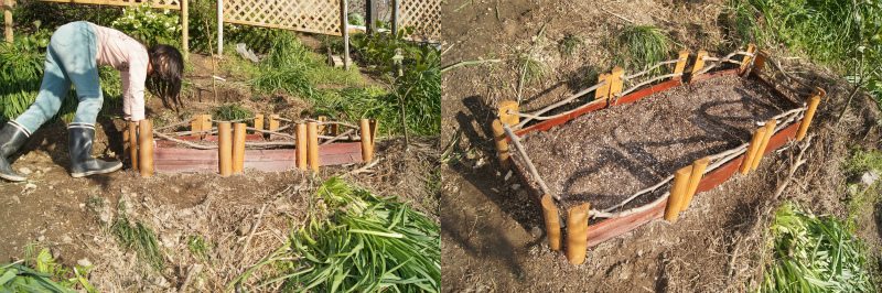 実用とデザインを両立させるのが我ガーデンのコンセプトなので、子供作と言えど2色のステインを2度塗りして防腐加工を施した後、小枝でお洒落柵をしつらえた花壇の囲い。こうしてみると結構デカイ。