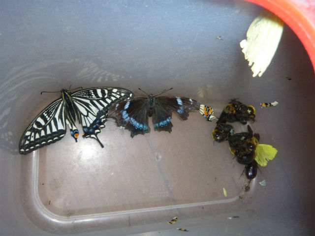 土曜の午前は恒例、散歩兼、公園遊び兼、公園トレ兼、虫取り。クマバチは危ないと思うかも知れないが、これは全て雄。雄は針を持たず、働かず、ただ威張り散らして、その生命力をメスにアピールするだけの遺伝子のショーケースに過ぎないのだ。交尾を終えたら用済みなので後は死ぬのみ。そしてこれらは全て鶏の餌になり、卵へと変換される。