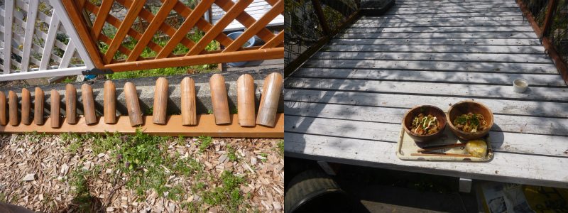 花壇への廃材利用がヒントになって、ブルーベリー園の土止めを廃材で作ることを思いつき、ステインで防腐処理。忙しいので庭飯。