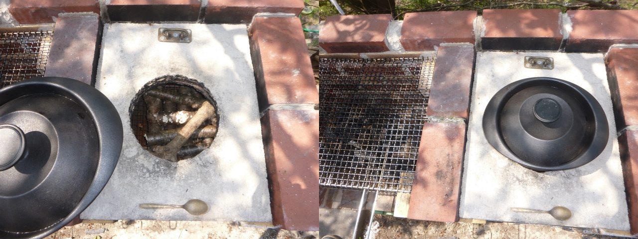 果樹園から出た選定枝を寝かせた薪に火を付ける。炎が立ち上がったら、お釜をパイルダーオン!
