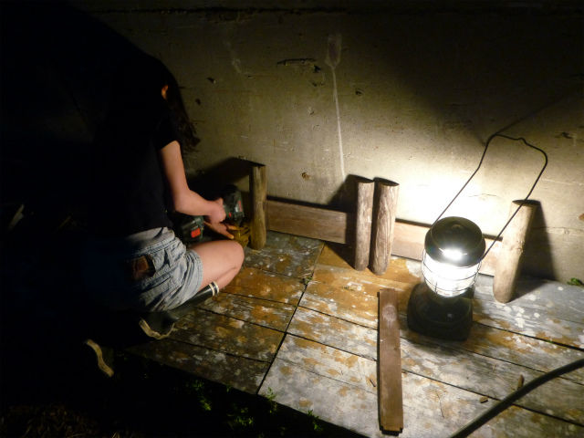 土止めを兼ねたちゃんとした囲いを提案するも、我家の資材部から調達するには勿体ない。そこで、廃材を利用することに。インパクトドライバーでドリドリする内に日は暮れてしまったが、最後までやりきりたいというので、ガソリンランプの下、継続。