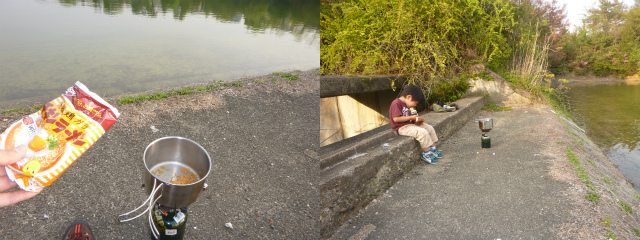 夕方、前日の散歩中に息子はんと見つけた秘密の場所にシングルバーナーとコッヘル一丁ぶら下げて赴き、チキンラーメンを作って食べた。