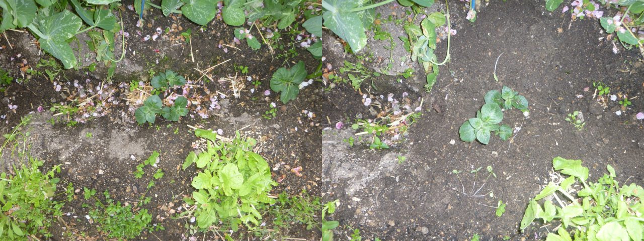 本日のノルマ。ジャガイモの土寄せ。土寄せは面倒な作業なので、ジャガイモが育つ頃に衰退する野菜の側に植付けて、その土を右から左へ移動させるように仕組むと楽。