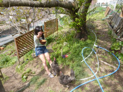 写真は、焼きそばをニワトリに見せて遊んでいる娘さんの図。