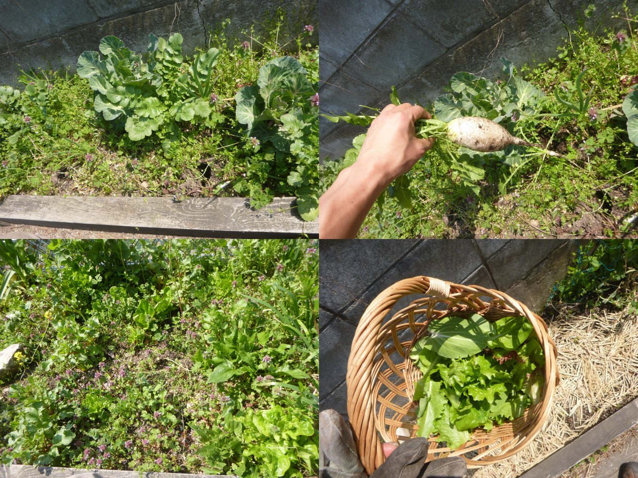 一見、雑草だらけにみえるが、おろし醤油ダレの為の大根やサンチュ、チンゲンサイなど。