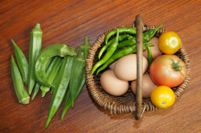 9月の朝飯前の作業を終えて戻って来ると、こんな感じ。オクラやトマトが8月よりも良く採れるようになった。