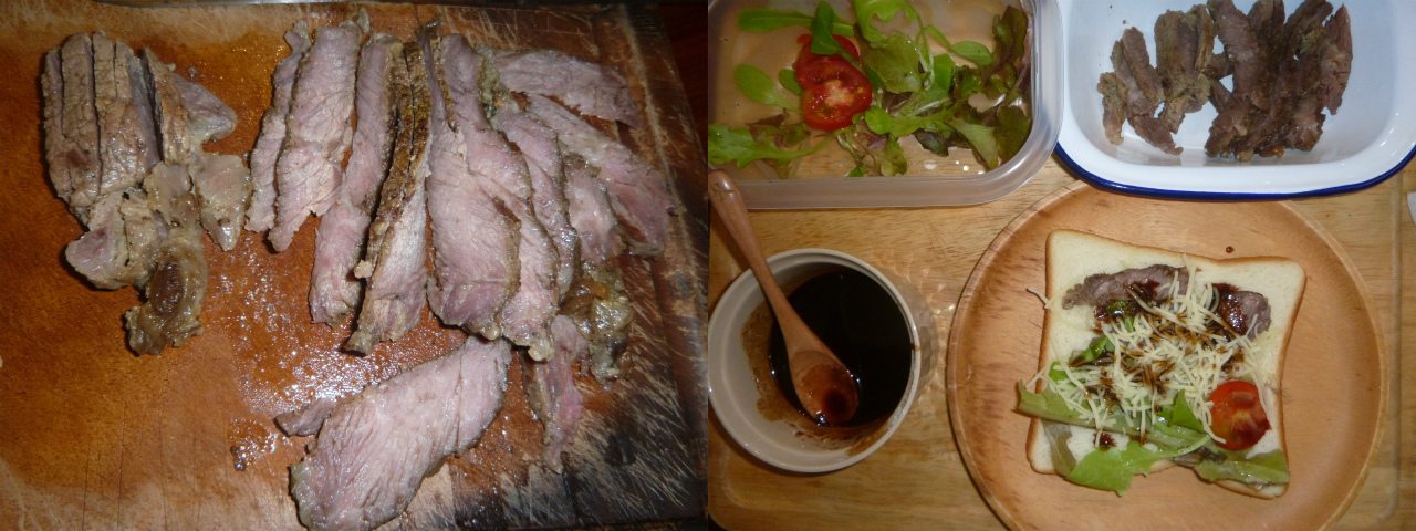 本日の昼食は、ローストビーフサンド。肉汁とバルサミコ酢で作ったソースが決め手。この季節ならではの間引き菜を挟む。