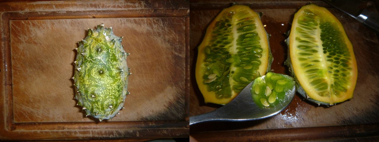 謎の宇宙生物キワーノが黄色くなってきたので試食会。たしかに、バナナとライムを足した味だが、世間の評判通り甘くない。例えるなら、うっかり砂糖を入れ忘れたバナナライムゼリー。鶏には好評だった。また、緑のカーテンとしては優秀。