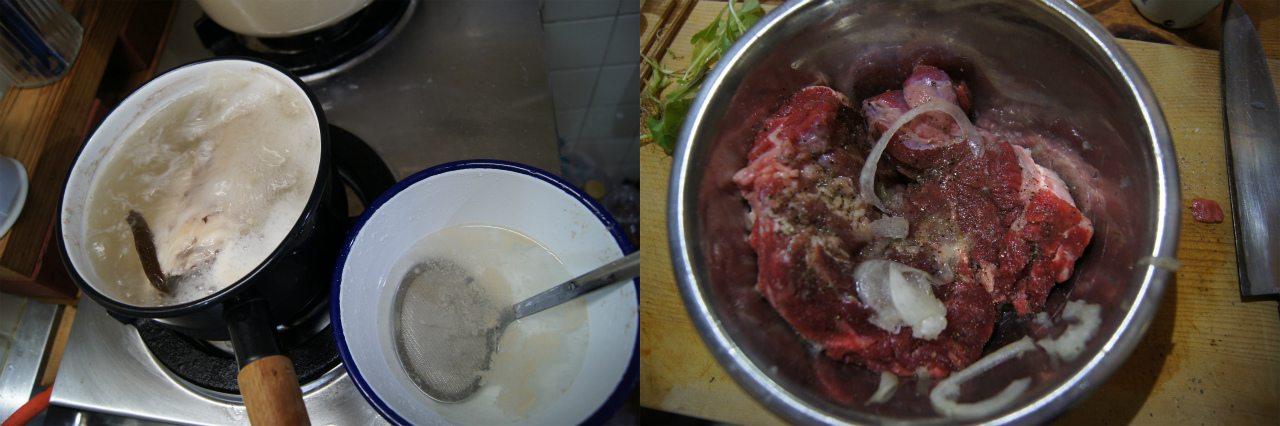 本日の作業は、鶏ガラスープ作り。平行して、お安いOGビーフを柔らかくしようと、ニンニクとタマネギのビール液につけ込む。