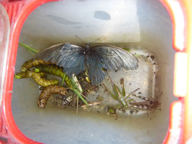散歩&トレーニング&虫取りを兼ねた町内ウォーキングへ。夏が終わって、昆虫もめっきり数を減らしたが、そこそこの収穫があった。このグロイ芋虫は、食べると美味しいと言われており、今年は何度も捕獲したのだが、乗り気がせずに尽くサナギになってしまい、結局は鶏の餌。