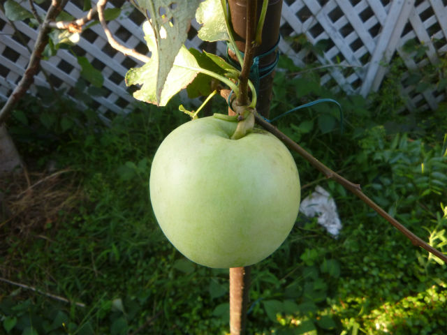 袋を外して日に当てている期間に、真っ赤になる前に落下したリンゴ。ニュートンよりも早く落下に気づかないとダンゴムシにかじられてしまう。食べて見るとすこぶる美味しい。そもそも、この品種が真っ赤になるものかどうかも解らないので、この状態が間全体なのかも知れない。