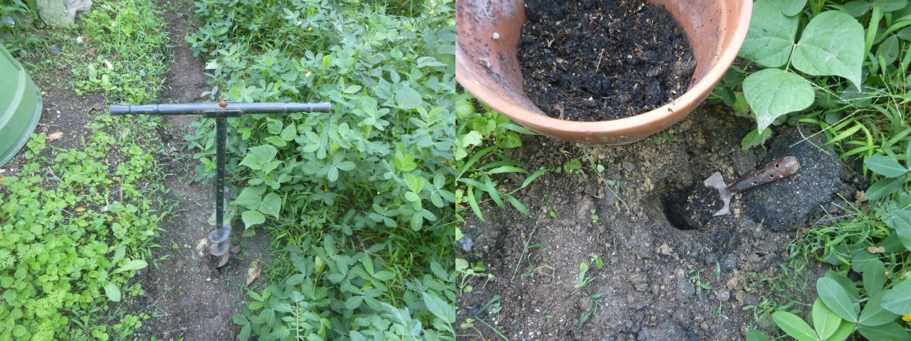 本日の朝飯前の作業。ドリルで果樹から少し離れた地面に穴を穿つ。その穴に、完熟させた鶏糞を埋める。来年の為の元肥となるが、生分解が遅いので早めに施すのが吉。写真だけ見るとピースフルだが、腰がおかしくなる重労働。