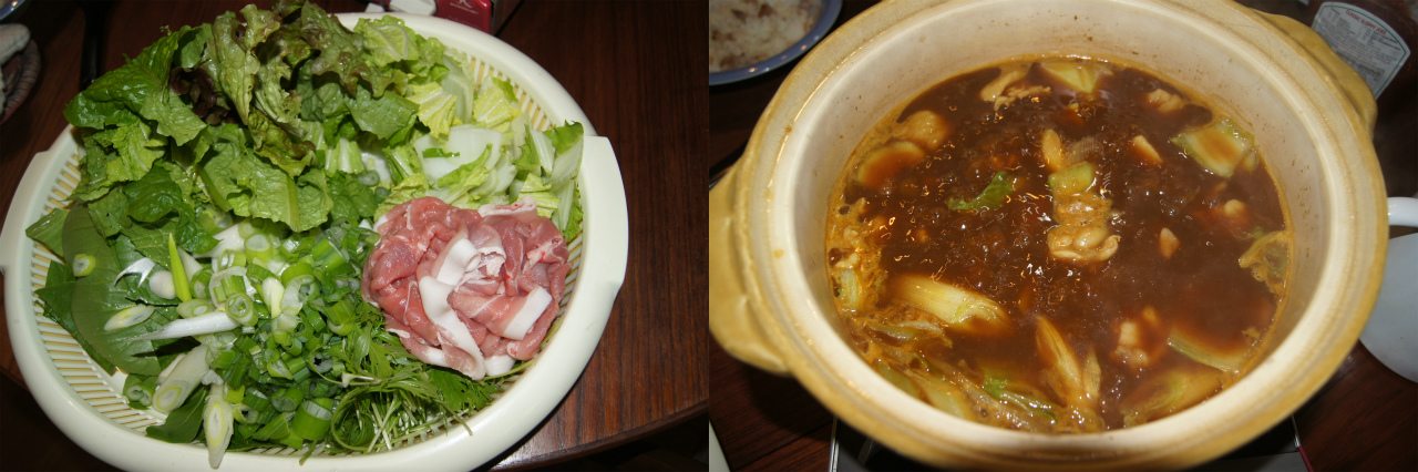 夜。ワイフの従弟が営む元祖カレー鍋専門店「伝心望」のカレー鍋セットを頂いた。カレー鍋は、レタスしゃぶしゃぶが美味しいので、庭からありとあらゆる葉の物を収穫してきた。かくして、野菜タップリ肉ちょっとのヘルシー鍋が始まった。