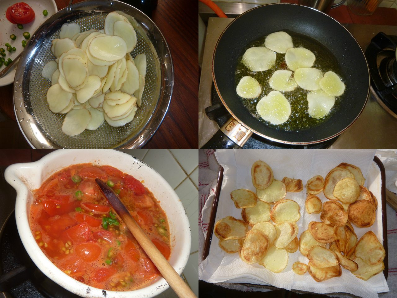 新ジャガが採れたので、スライサーでスライスし、しばらく水にさらしてから、揚げてみた。その傍ら、副業で未だに採れるトマトをトマトソースへ加工。
