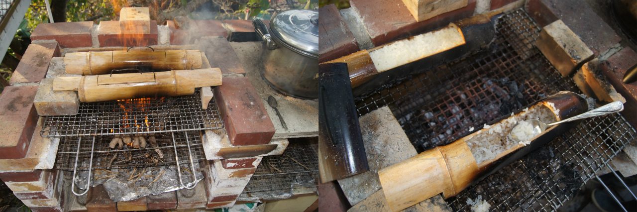メインの薪を組み、その下に樹脂を多く含むチェリーの小枝でやぐらを組み、更にその下に着火剤となる小豆の鞘を敷いて点火。写真のように炎が上がるくらいの火力で一気に炊飯するので、竹飯盒への着火のかなり前から、カレーの調理を始めておき、カレーの完成が近づいてきてから炊飯を始めるのがコツ。ちなみに手前が子供達作の竹飯盒で、奥がマスター作の見本。