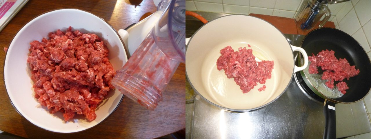 今日はワイフの誕生会。エビクリームグラタン、ビーフシチュー、ホワイトシチューの候補を下して、ミートソースがオーダーされたので、ミンサーで肉をミンチに。余りに大量なので、肉汁が出過ぎて肝心の焦げ目が付かない可能性があるので、ミンチを二つに分けて炒めた。