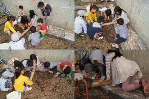 ご飯を炊くための飯盒を竹で作る。見本品と手引き書を用意しておき、できるだけ口も手も出さない。時間はかかるが、子供なりに交代交代で、あれこれと試行錯誤。