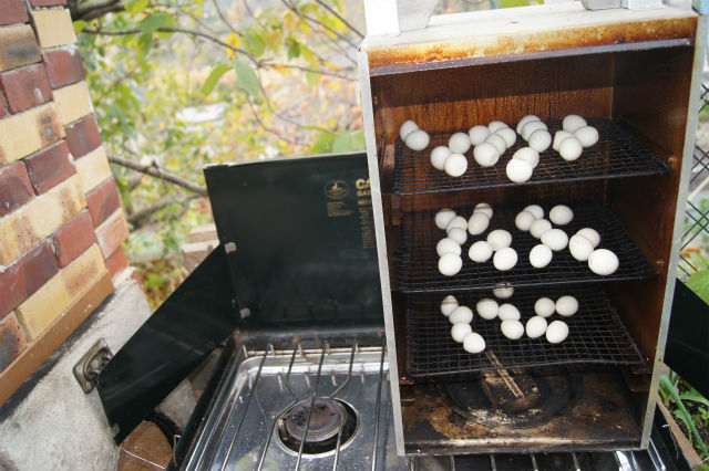 その間、私はウズラの卵の燻製作りに精を出す。ウズラとなると手間暇かかりそうであるが、業務スーパーでタイ産の剥き身の大きな缶詰が売られているのを発見したのだ。缶から出して、ウィスキー樽のスモークウッドで冷燻するだけ。