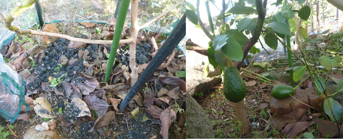 写真左は、耐寒性がやや低いハスというアボカド。例年は簡易温室で囲ってパネルヒーターとサーモスタットの併用で越冬させるのだが、明らかにコストをかけ過ぎなので、今年は株元に枯葉と鶏糞と米ぬかを敷き詰めて、発酵熱で何とかならないか実験。右はフェルテと言う品種。こちらは耐寒性が高いので、今年は完全露地栽培。