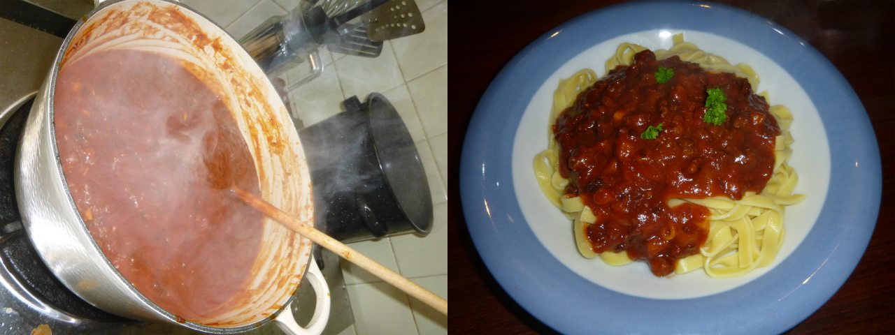 ミートソースは時間を最も喰う煮込み料理の一つである。煮込むこと2時間以上、本物のミートソースが完成した。