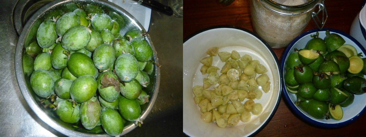 ホビー果樹園設計で最も失敗したのが、フェイジョアを4本も植えてしまったことである。買えばそれなりの値がするアポロ、クーリッジ、トライアンフ、マンモスの実が庭中に死屍累々。果物好きの娘さんと私が食べないからだ。余りに勿体ないので、ジャムにすれば消費が進むのではないかと、中身をくりぬいているの図。