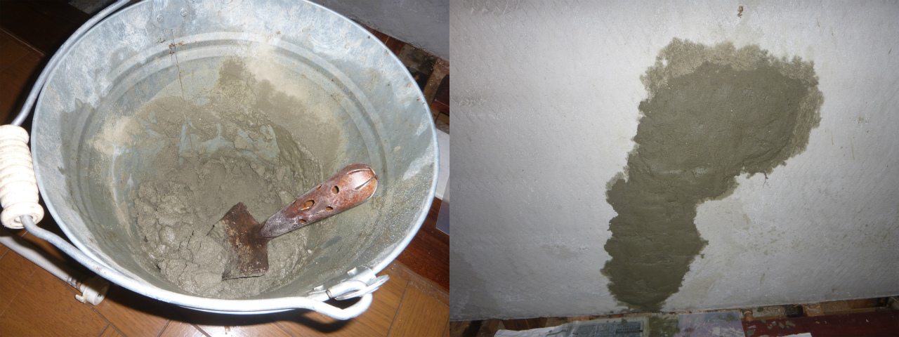 穴の空いた壁にモルタルを練り込む。セメントの原料は基本的に西から東へ流れるそうだが、西でもアレコレ燃やした物を混ぜちゃってる物もあるので、室内用選びは難しいと言う今月の豆知識。