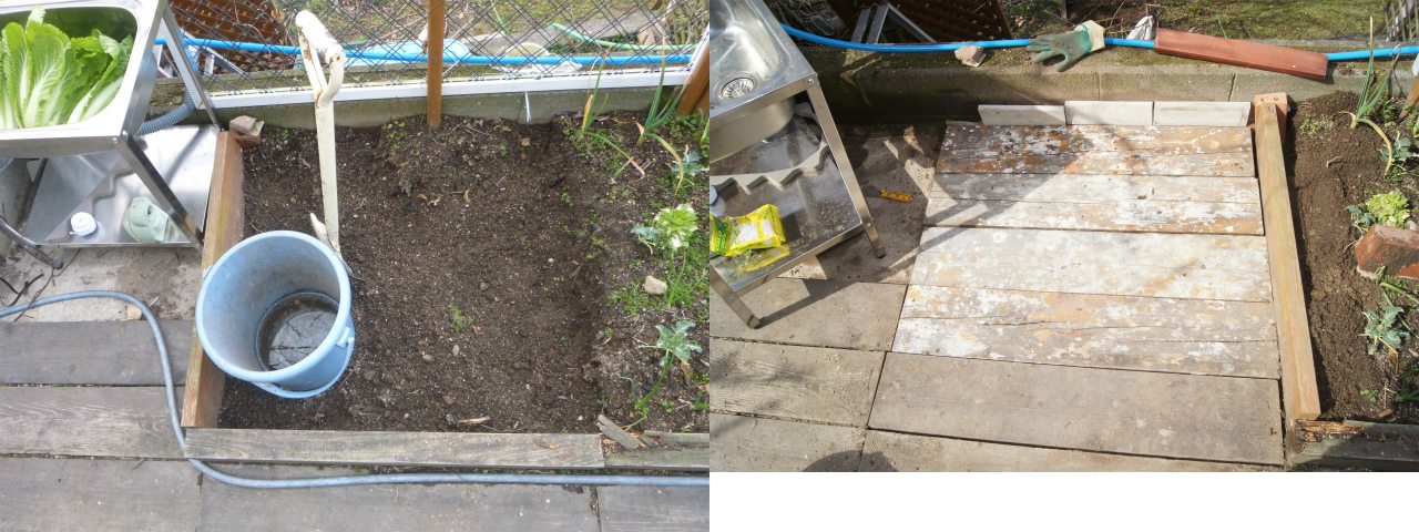 台所に業務用の流しを入れたので、野外用の流しが本来の場所へ来ることとなった。そして、再々塗装された作業台も入るので、野外キッチンの拡張が必須。以前のスペースは、トントンで整地してからジャリコンを入れ、最後にカラーモルタルを敷いたのだが、流石に今回はその様な気力も予算もない。そもそも、菜園の一部を潰すことになるのだが、その為の土を掻き出すだけでもギックリ腰確定コース。どうやって固く平らなスペースを作るか思案していたところ、多目的広場を広げるために枕木の道を狭くする議案があったことを思い出した。その過程で撤去される枕木をここにはめ込めば良いのだ。と言う訳で、ゼロベース予算で行程がかなり簡略化されたが、結局腰痛。2月28日(土)