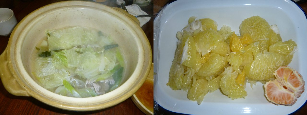 これが風邪対策のシンプル一人鍋の写真である。昆布白菜豆腐肉少々を昆布鰹不使用の味ぽんで。私は柑橘ジュースは飲むが、柑橘類を剥いてまで食べない。しかし、皮に用があるときは、剥くの図(ザボンとハッサク)。2月14日(土)