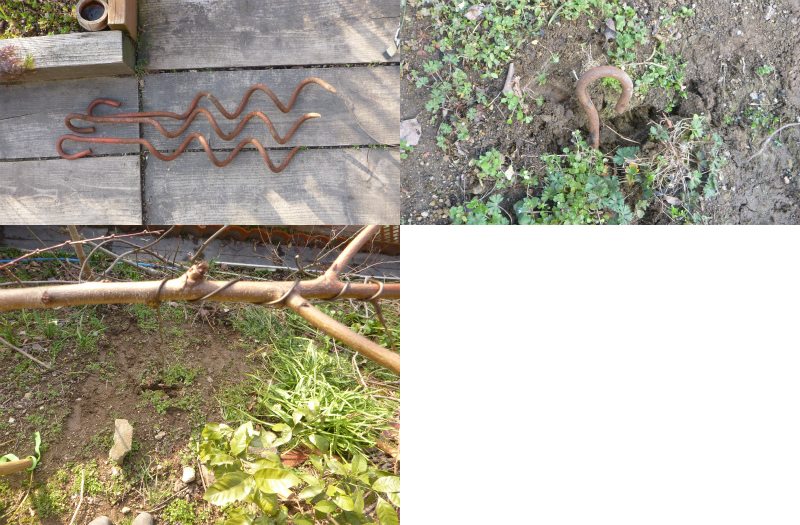 落胆と途方に暮れていたが、春が間近に迫ってきているので、果樹の下準備に切り替え。魔貫光殺法のような螺旋アンカーを資材部から発掘。地面にドリドリと打ち込む。然る後、大木性が強い果樹の低身長化や枝の混み合い解消の為、枝先に針金を巻いて、アンカーに結びつけることで整形、開帳し、日当たりと作業性を向上させる。2月25日(水)