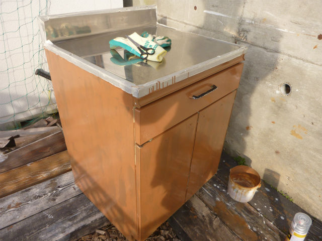 古びた乳白色のステンレス台を茶色く塗った。これは非常に上手く行った。もう、これで充分に庭におけるレベルやん!と。