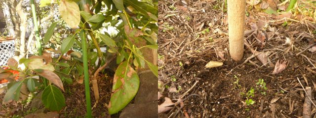 今頃になって、しっかりと根付いた果樹や庭木が突然枯死してしまう原因の一つが解った。フト気がつくと寒さに強いはずのフェルテと言うアボカドが痛く弱っていた。寒さにやられたのかと思ったが株元を観察すると、餌撒きん家の外飼い猫のトイレになっていたのだ。ここまで大きく育ったアボカドの樹なんて売ってへんでと、急ぎ土の中和と希釈処理をして、株元をブルーシートで覆った。