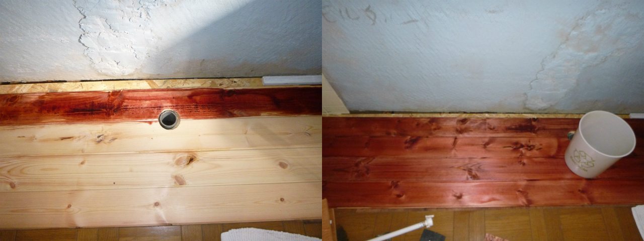 台所シンク下の床を全部剥がしてしまったので、合板を貼ってから、配水管を通す穴を空けた合わせ床材を貼る。床材はワトコオイルで塗装。