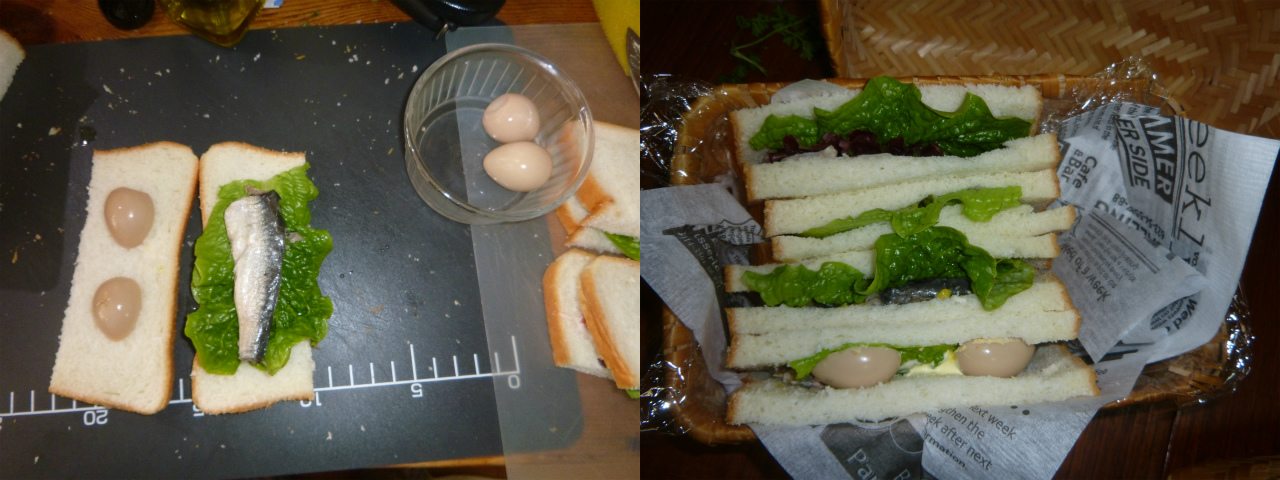 今日は息子はんが通うプレ幼稚園の参観日。保護者一名分の昼食が出るが親が二人とも行くので、自分の分の弁当をこさえた。ウズラとオイルサーディン(ペルー)の100均缶詰コンビのサンドが意外に旨い。