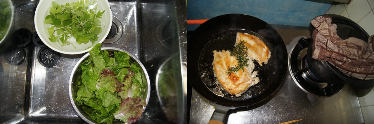 今日は娘さんの幼稚園時代の友人の発表会へワイフ達が行っているので、息子はんと二人で留守番。こんな時でもちゃんとした食事を摂ろうということで、菜園でベビーリーフとローズマリーを採って来て、チキンステーキを焼く。