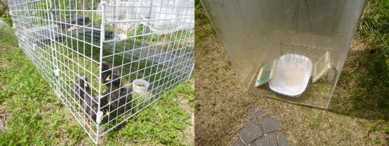 100均素材でひよこ小屋のベースを作ったがボツに。直ぐに解体にかかろうと思ったが、ひよこを庭で散歩させるのに使えた。カラスや猫からは、ある程度守られるので、放牧(?)可能。小さい内から土をつつかせて、様々な菌を摂り込ませ腸内細菌叢を安定させないといけない。
