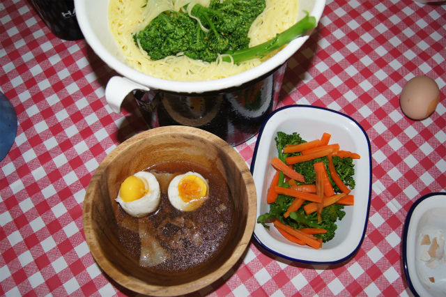 ブロッコリーなどの野菜が採れだした。滞りなく消費していかねば、溜まってしまう。そこで、つけ麺の盛り合わせで使えるのではと思い、昆布、鰹、酒、砂糖、塩、みりんで出汁を作り、麺のみ単品販売の棒ラーメンを茹でた。