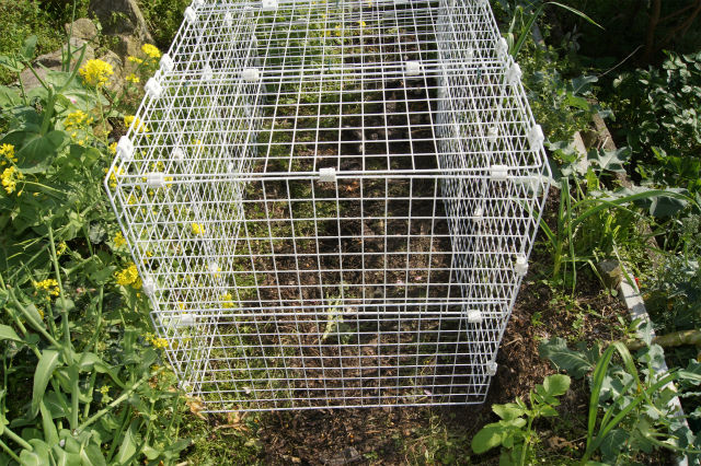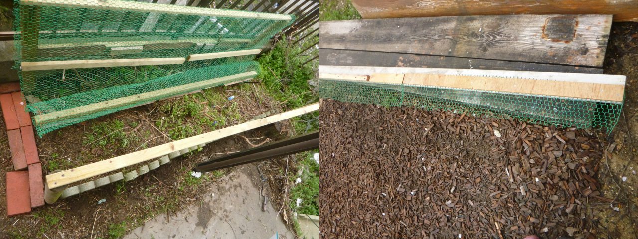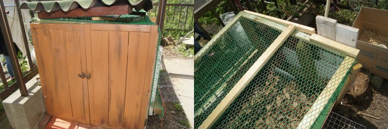 ひよこ生育小屋を作らねばならないが、どうしても基礎工事などの労力とコストをかけたくない。見た目は不細工でも、要はイタチに入られなければ良いのだと、庭のC〜Dランクの区画に、できるだけ廃材を利用して製作することに決定。4月10日(金)