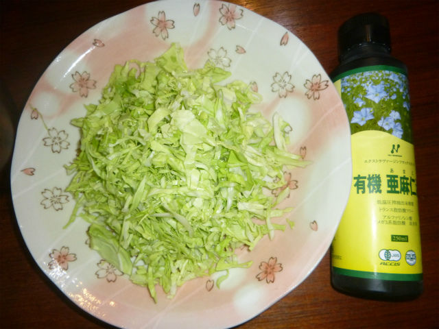 夏キャベツは農薬を使わないと不可能なので、春キャベツしかつくらないが、農薬にはもう一つの効果がある。野鳥が食べないのだ。と言うことで、防鳥ネットの中で育った無農薬の春キャベツがいよいよ食卓へ。岩塩とNZ産の有機栽培亜麻仁油をかけて頂く(最後は宣伝)。【Ex】