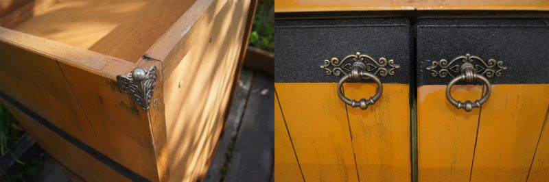 台所改修の際に廃棄される予定であったボロボロのステンレス台を野外キッチン用にリペイントしたのは良いが、付け替えたアンティーク取っ手は600円以上したはずなので、より安価な100均のものと交換。防腐処理はしたが地面と接触すると、傷むのが早かろうと、これまた100均の足を付けた。