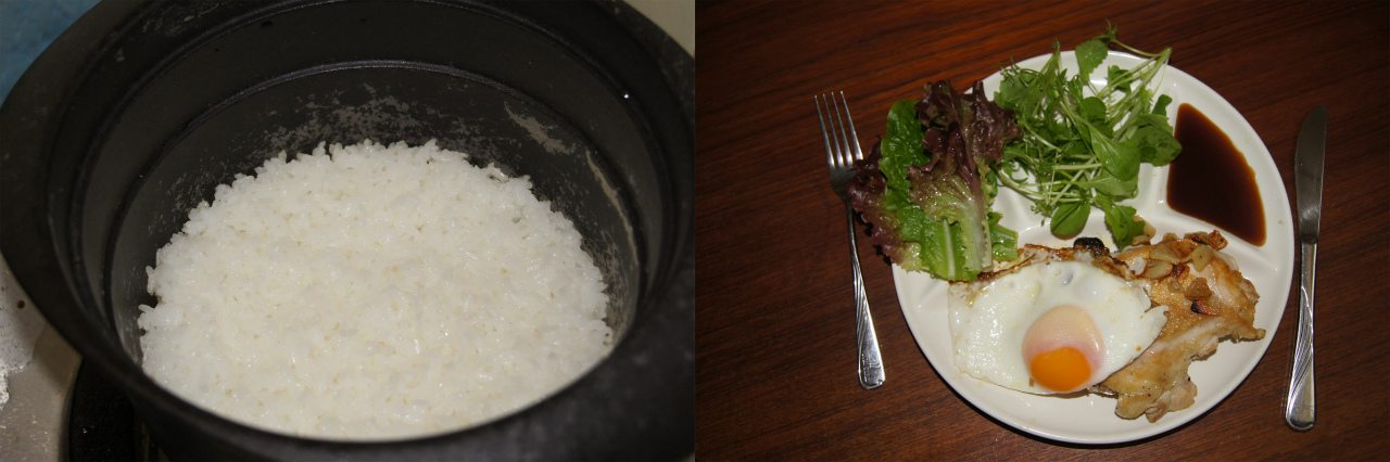 ご飯は、急いでいたのでジャーではなく、お釜のガス炊き。チキンステーキに目玉焼きを乗せて、何だかガスト系。