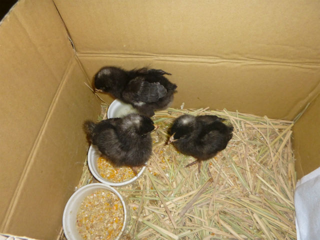 ひよこ。市販の飼料は使用せず、減農薬栽培の玄米を精米した際に発生する米ぬかとオカラを混ぜた物と、トウモロコシや大麦、カニ殻等をミキサーで粉砕した物とをブレンド。