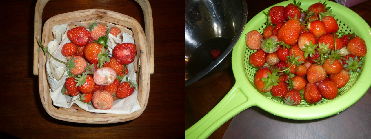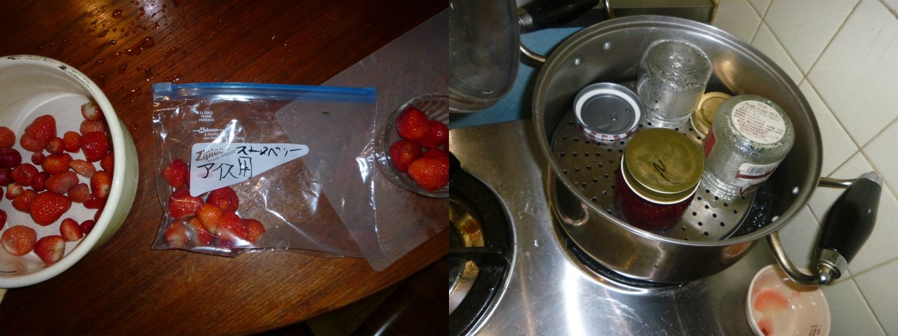 夜。神経質に洗った後、包丁でヘタを外し、ジャム用、アイスクリーム用、生食用とイチゴを選別する。加工用イチゴが冷凍庫を圧迫してきたので、昨年のラズベリーを解凍してジャム化。