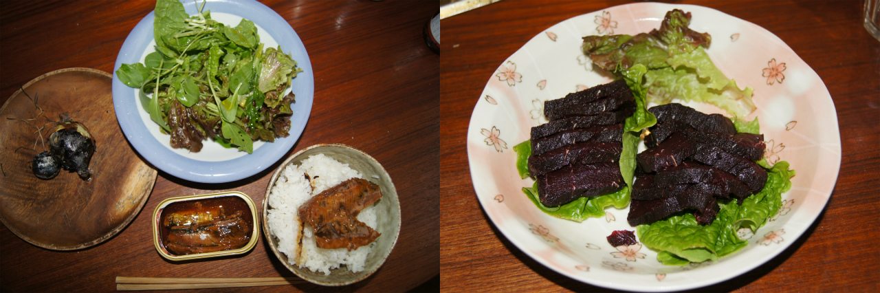 と言う訳で、4年前に買い溜めた賞味期限切れと缶詰と、ムンズと抜いてそのまま薪の中に放り込まれてロトロになったタマネギが昼食。晩飯は、ベリー狩りシーズンに向けて、冷凍庫空けないといけないので、真空パックの鯨を解凍したもの(これも大きく賞味期限切れ)。